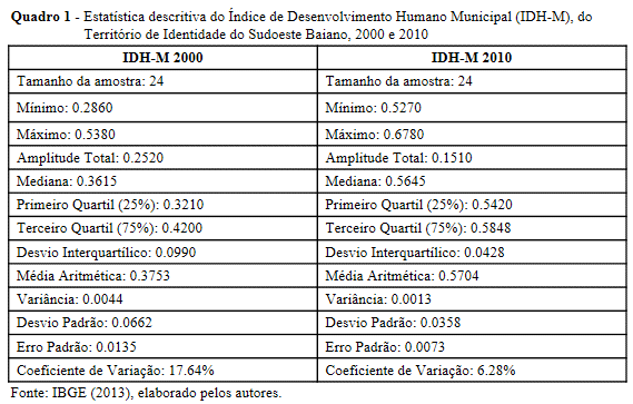 - Quadro 1 - Estatística descritiva do Índice de Desenvolvimento Humano Municipal (IDH-M), do Território de Identidade do Sudoeste Baiano, 2000 e 2010