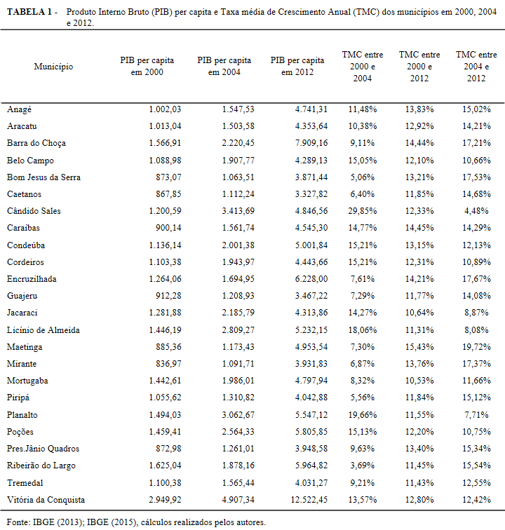 - TABELA 1 - Produto Interno Bruto (PIB) per capita e Taxa média de Crescimento Anual (TMC) dos municípios em 2000, 2004 e 2012.