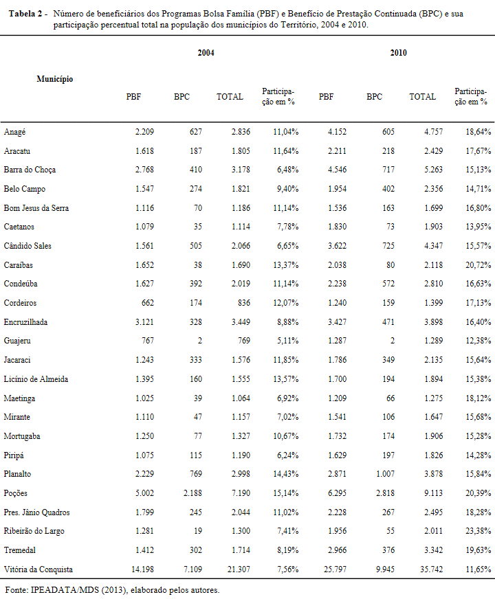 - Tabela 2 - Número de beneficiários dos Programas Bolsa Família (PBF) e Benefício de Prestação Continuada (BPC) e sua participação percentual total na população dos municípios do Território, 2004 e 2010.