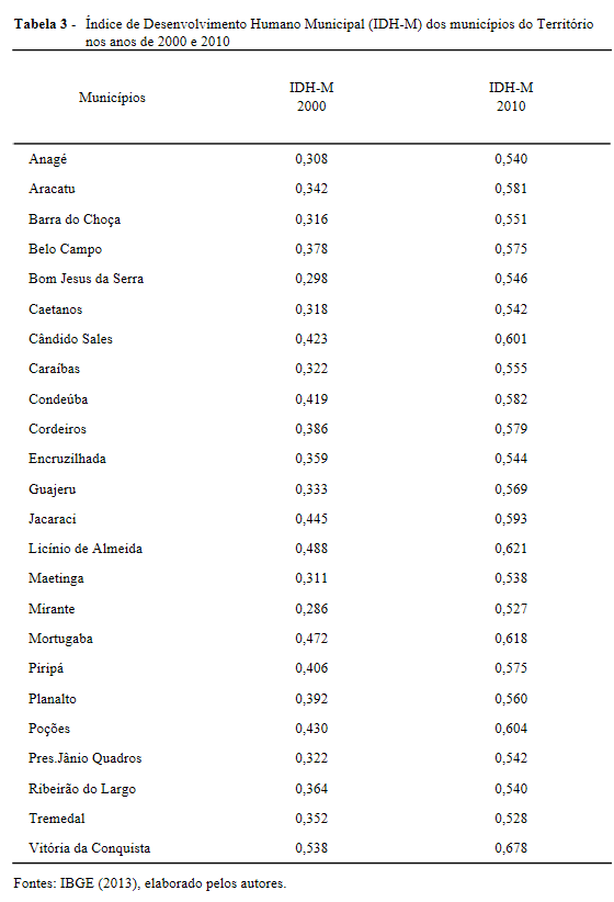 - Tabela 3 - Índice de Desenvolvimento Humano Municipal (IDH-M) dos municípios do Território nos anos de 2000 e 2010.